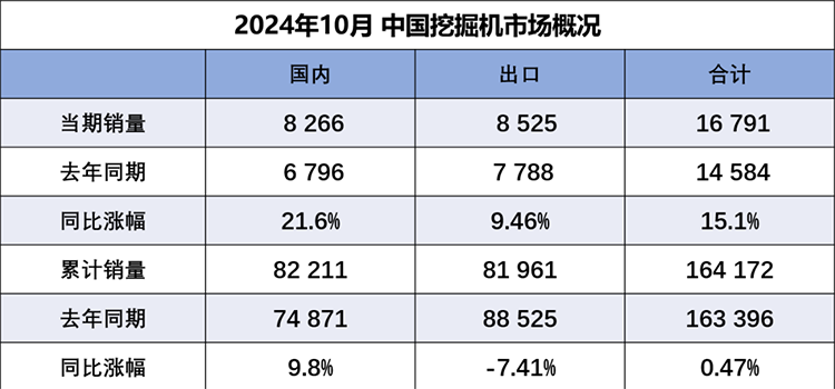 2024 11-15【行業動態】:2024年10月挖掘機國內(nèi)市場銷量8266台,同比增長21.6% 據中國(guó)工程機械工業協會對挖掘機主要(yào)製造企業統計,2024年10月銷售各類挖掘機16791台,同比增長(zhǎng)15.1%。其中國內銷量8266台,同比增(zēng)長(zhǎng)21.6%;出口量8525台,同... 查看(kàn)更多
