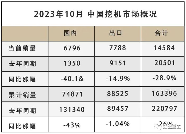 據中國工程機(jī)械工業協會(huì)對(duì)挖掘機主要製造企業統計,2023年10月銷售各類挖掘機14584台,同比下降28.9%,其中國內6796台,同比下(xià)降40.1%;出口7788台,同比下降14.9%。
