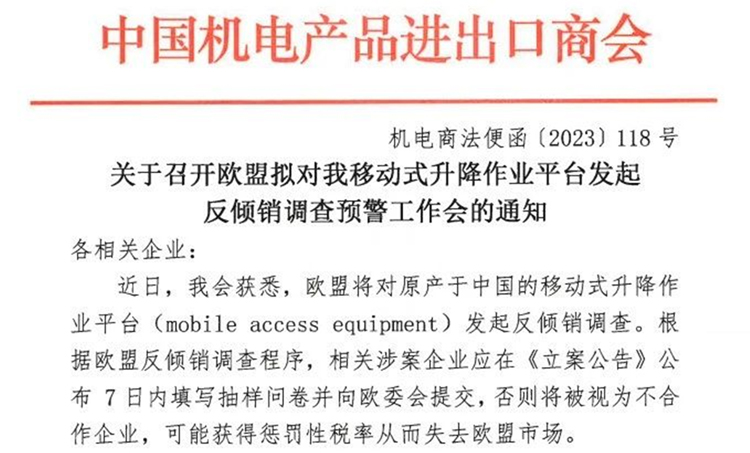 近日,中(zhōng)國機電產品(pǐn)進出口商會獲悉,歐盟將對原產於中國的移動式升降作業平台 (mobiles access equipment) 發起反傾銷(xiāo)調查。根據歐盟反傾銷調查程序,相關涉(shè)案(àn)企業應在《立案公告(gào)》公布(bù)7日內填寫抽樣問卷(juàn)並向歐委會提(tí)交(jiāo),否則將被視為不合作企業,可能獲得懲罰性(xìng)稅(shuì)率從(cóng)而失去歐盟市場。