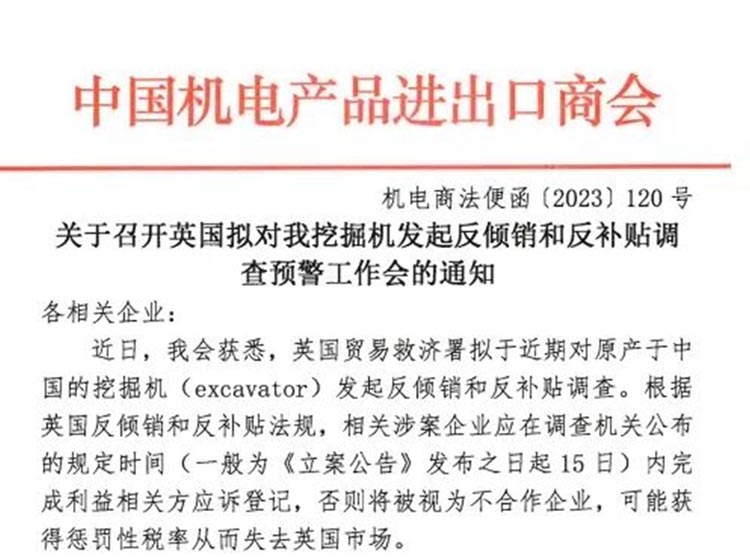 2023年11月13日,中國機電(diàn)產品進出口商會(huì)發文稱,英國貿易救濟署擬於近期對原產於中國的挖掘機(excavator)發起反傾銷和反補貼調查。根據英國(guó)反傾銷和反(fǎn)補(bǔ)貼法規,相關涉案(àn)企業應(yīng)在調(diào)查機(jī)關公布的規定時間(一般為《立案公告》發布之日起15日)內完成利益相關方應訴登記,否則將被視為不合作企業,可能(néng)獲得懲(chéng)罰(fá)性稅率從而失(shī)去英國市場。