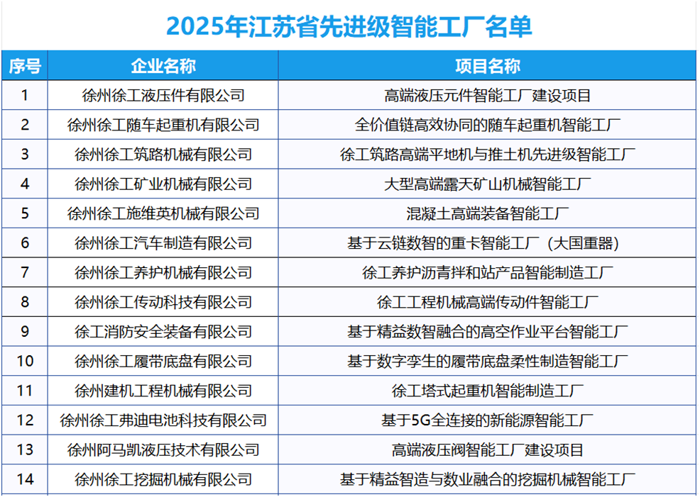 2024年,工業和信息化部辦公廳、國(guó)家發展改革委辦公廳、財政部辦公廳(tīng)、國務院國資委辦公廳、市場監管總局辦公廳、國家數據(jù)局綜合司六部門聯合啟動智能工(gōng)廠梯度培育行(háng)動,按照基(jī)礎級、先進級、卓越級(jí)和領航級,四個層級(jí)構(gòu)建智能工廠(chǎng)梯度培(péi)育體係。目前,徐工已有21家單位入選(xuǎn)先進級智能工廠。