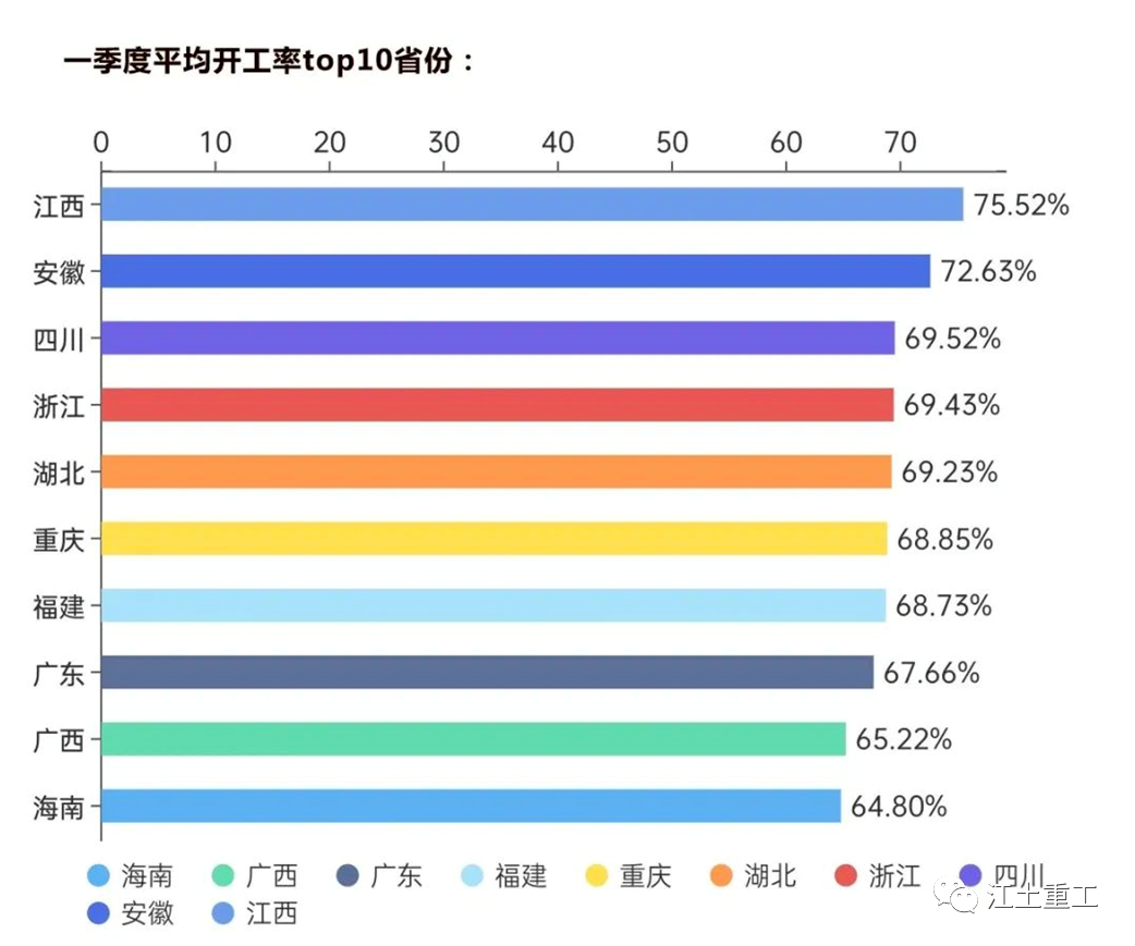一季度,全國工程機械平均開工率為53.14%,整體已經呈現經濟複蘇、逐月向好的態勢。按月份來看,1月單月開工(gōng)率40.61%,2月單月開工率53.77%,3月單月開工率65.05%,呈(chéng)現快速恢複、逐月向好的態勢,表(biǎo)明年初以來我國各項基礎設施建(jiàn)設持續加速。