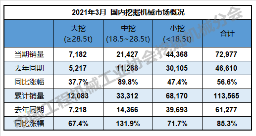 根據中國工程機械(xiè)工業協會行(háng)業(yè)統計數據,2021年1—3月納入統計的26家主機(jī)製造企業,共計銷售各類挖掘機械產品126,941台,同比漲幅85.0%。其中,國內市場銷量113,565台,同比漲幅85.3%;出口銷量13,376台,同比漲幅81.9%。