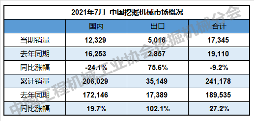 根據中國工程機(jī)械工業協會(huì)行業統(tǒng)計數(shù)據,2021年1—7月納入統計的25家主機製造企業,共計銷(xiāo)售各類挖掘機械(xiè)產品241,178台,同比增長27.2%。其(qí)中,國內市場銷量206,029台,同比增長19.7%;出口銷量(liàng)35,149台(tái),同比增長102.1%。