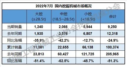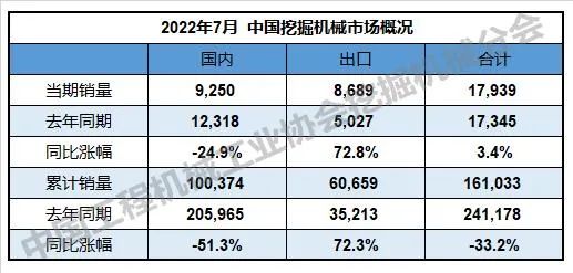 2022年7月,共計銷售各類挖掘機械產品17,939台,同比增長3.4%。其中,國內市場銷量(liàng)9,250台(tái),同比下降24.9%;出口銷量8,689台,同比增長72.8%。