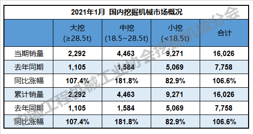 根據(jù)中國工程機(jī)械工業協(xié)會行業統計數據,2021年1月納入統計的(de)26家主(zhǔ)機(jī)製造企業,共(gòng)計銷售各類(lèi)挖掘機械(xiè)產品19,601台,同比漲幅97.2%。