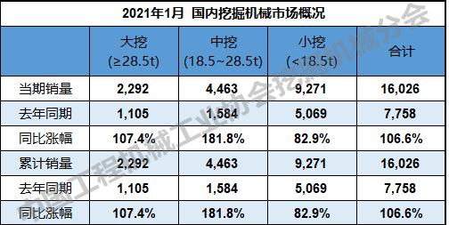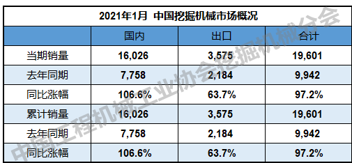 根(gēn)據中國工程(chéng)機械工業協會行業統計數據,2021年1月納入統計的26家主機製造企業,共計銷售各類挖掘機械產品19,601台,同比漲幅(fú)97.2%。